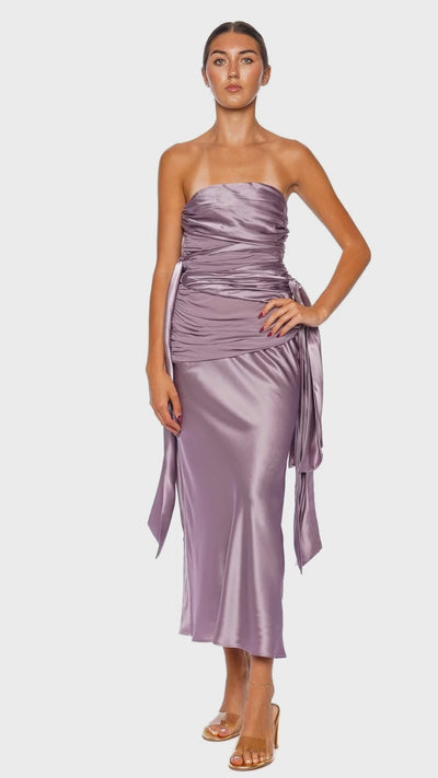Mauve Knotted Silk Gathered Midi Dress