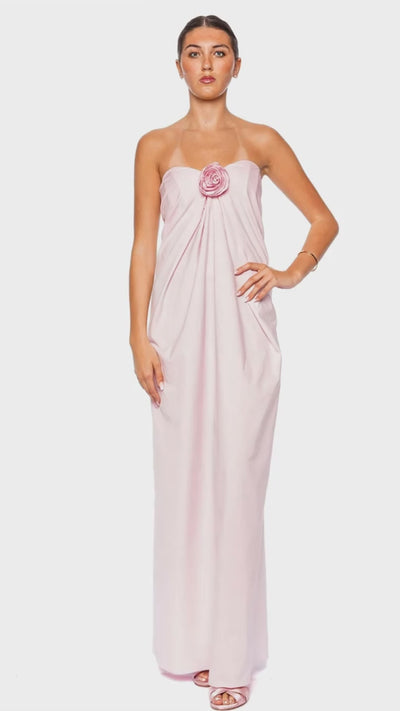 Embrace elegance with the Kyra Strapless Maxi Dress in a charming peony pink hue. This exquisite piece features a beautifully crafted rosette detail at the bodice, adding a touch of whimsy to its sophisticated silhouette. The luxurious drape and floor-length design make this dress ideal for formal occasions, while its timeless strapless cut enhances your graceful poise. Perfect for standout style, pair it with silver accessories and strappy heels to complete your look.