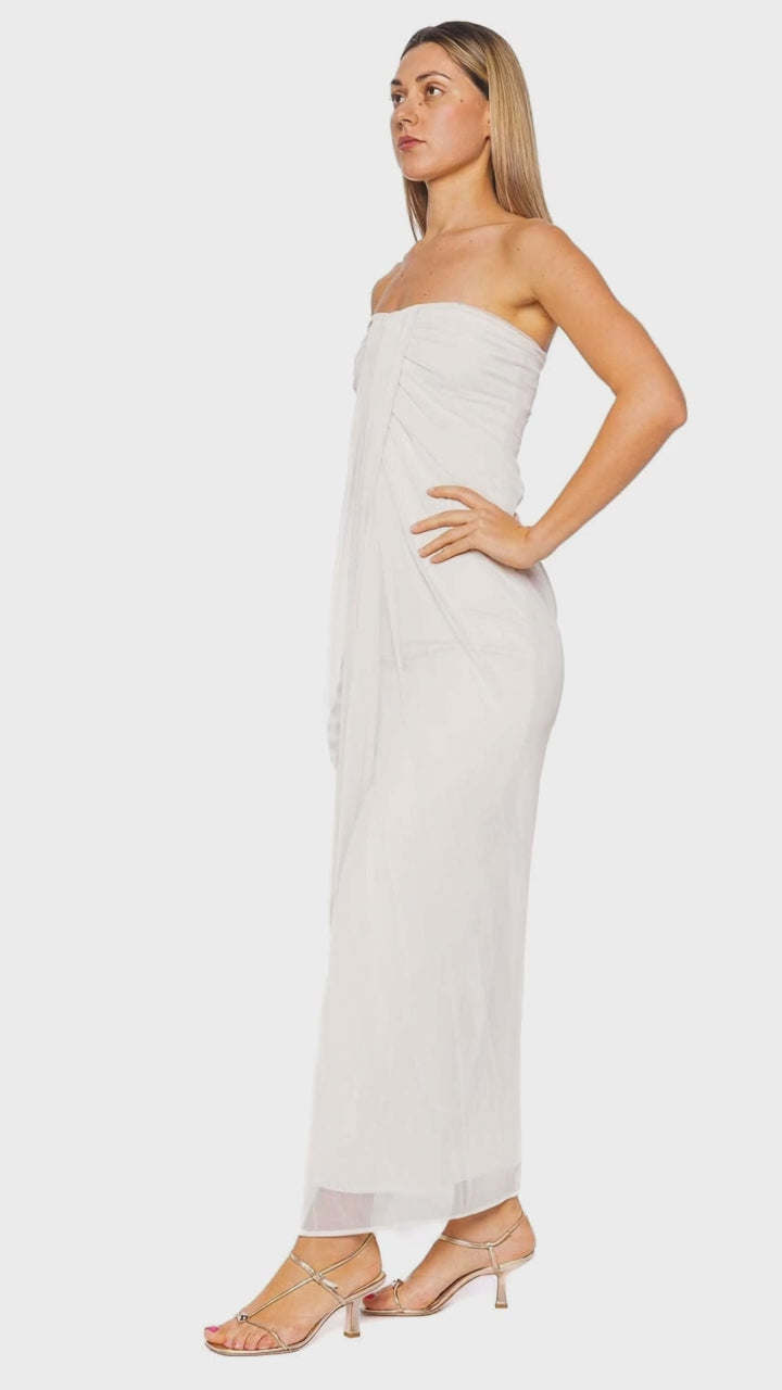The Lena Ivory Strapless Maxi Dress exudes grace with its soft, flowing silhouette and elegant ivory hue. Expertly crafted from high-quality fabric, this strapless style is perfect for any sophisticated occasion. The dress features a minimalist design that highlights understated luxury, making it an exquisite choice for both casual and formal settings. Pair it with metallic strappy heels and delicate accessories to enhance its refined charm.