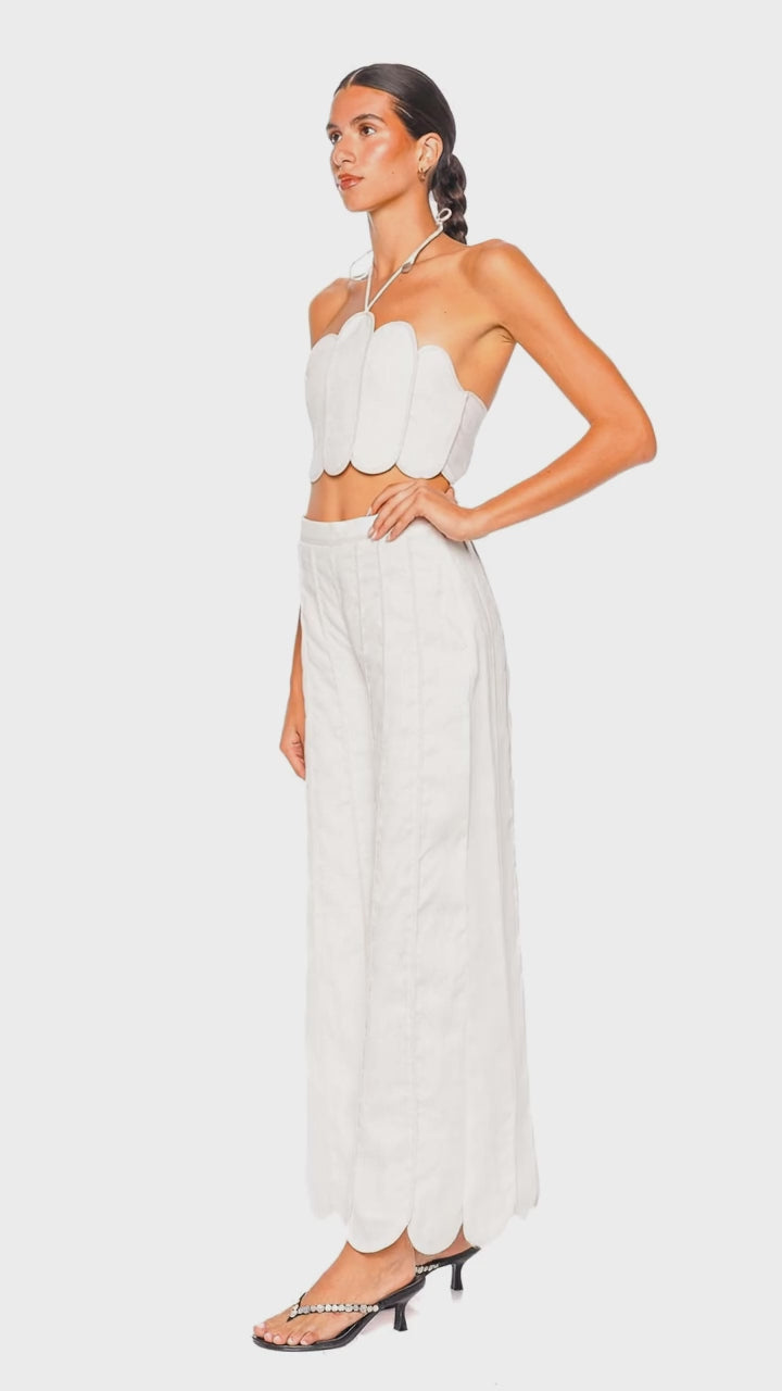 This striking crop top features a unique scalloped design that creates a bold, modern silhouette. Crafted from premium fabric with a soft ivory hue, it adds a touch of sophistication and elegance to any ensemble. The top’s minimalist style is perfect for refined looks, whether paired with tailored trousers or a flowing skirt. Elevate your evening wear with this avant-garde piece, ideal for making an elegant statement.