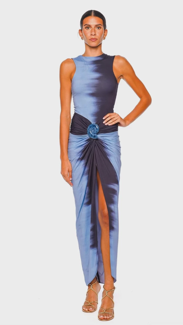 This stunning midi dress features a striking night blue pattern crafted from a luxurious stretch jersey fabric that drapes elegantly. The design is highlighted by a sophisticated sleeveless silhouette and a unique front twist detail, adding a touch of modern glamour. Perfect for evening events or sophisticated gatherings, this dress exudes timeless allure and effortless style. Pair with metallic heels and statement earrings to complete the ensemble.