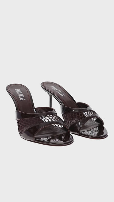 An open toe mule with a covered pin heel in white mesh and patent leather.