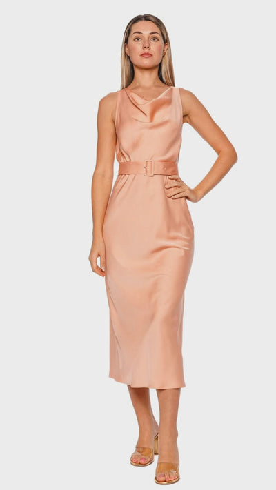 Exude chic sophistication with this Dune Sleeveless Satin Belted Midi Dress, crafted from sumptuous satin fabric that drapes elegantly over the body. The dress features a sleek, sleeveless design with a soft cowl neckline, adding a touch of timeless elegance. The matching belt accentuates the waist, creating a graceful silhouette perfect for any high-end soirée. Pair with strappy heels and statement earrings for a refined, fashion-forward look.