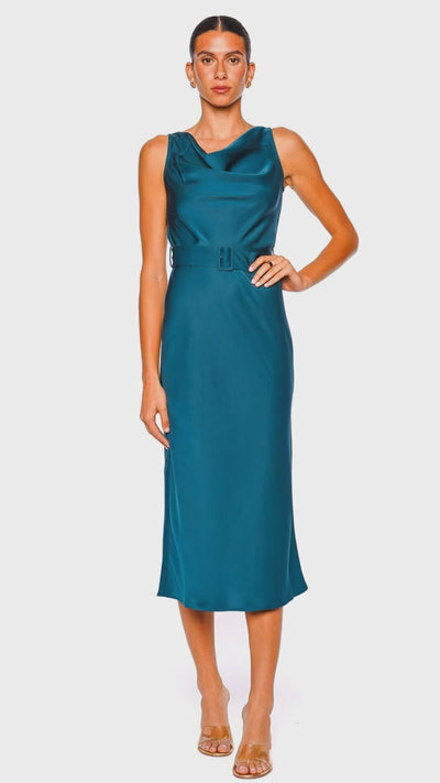 Dark Teal Sleeveless Satin Belted Midi Dress
