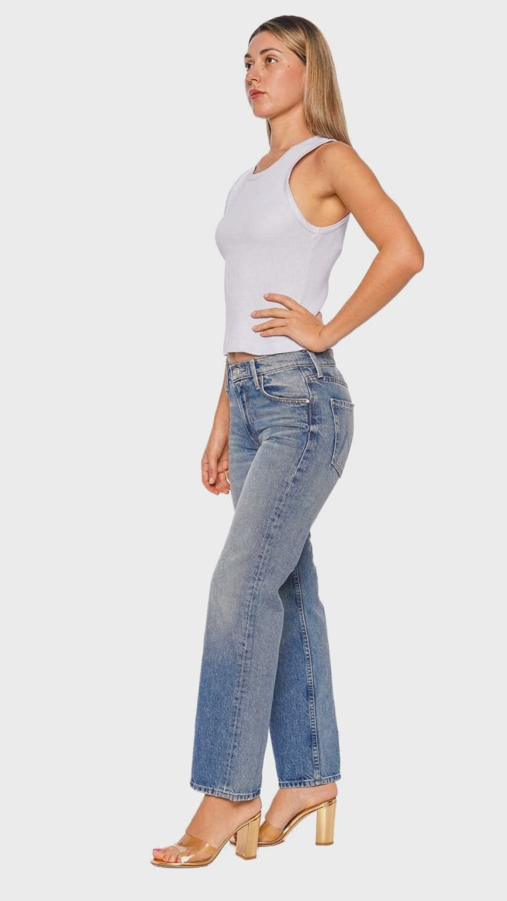 Crafted with premium denim, these straight-leg jeans offer a sleek and timeless silhouette. Adjusted proportions are deisgned to fit petite body types 5'4" and under. The classic early blue wash adds a touch of vintage-inspired charm, making them a versatile addition to any wardrobe. With meticulous attention to detail, these jeans are perfect for both relaxed and sophisticated settings. Pair them with a fitted tank and heels for a chic daytime look.