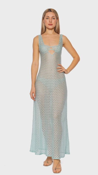 This exquisite aquamarine cover-up embodies beachside elegance with its sheer mesh lamé fabric and breezy sleeveless design. The intricate spiderweb pattern and plunging neckline reveal a hint of boldness, making it an alluring choice for sun-soaked afternoons. Perfect as a layer over your favorite swimwear, it transforms any seaside outing into a fashion-forward affair.