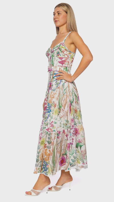 Channel effortless elegance with this enchanting long dress, adorned in a mesmerizing floral print that exudes a summery, bohemian charm. The delicate lace trim on the straps and neckline adds a subtle feminine touch, while the cinched waist beautifully enhances the silhouette. Perfect for garden parties and brunches alike, this dress promises to be a standout wherever you go. Pair with strappy sandals and a wicker bag for a chic daytime ensemble.