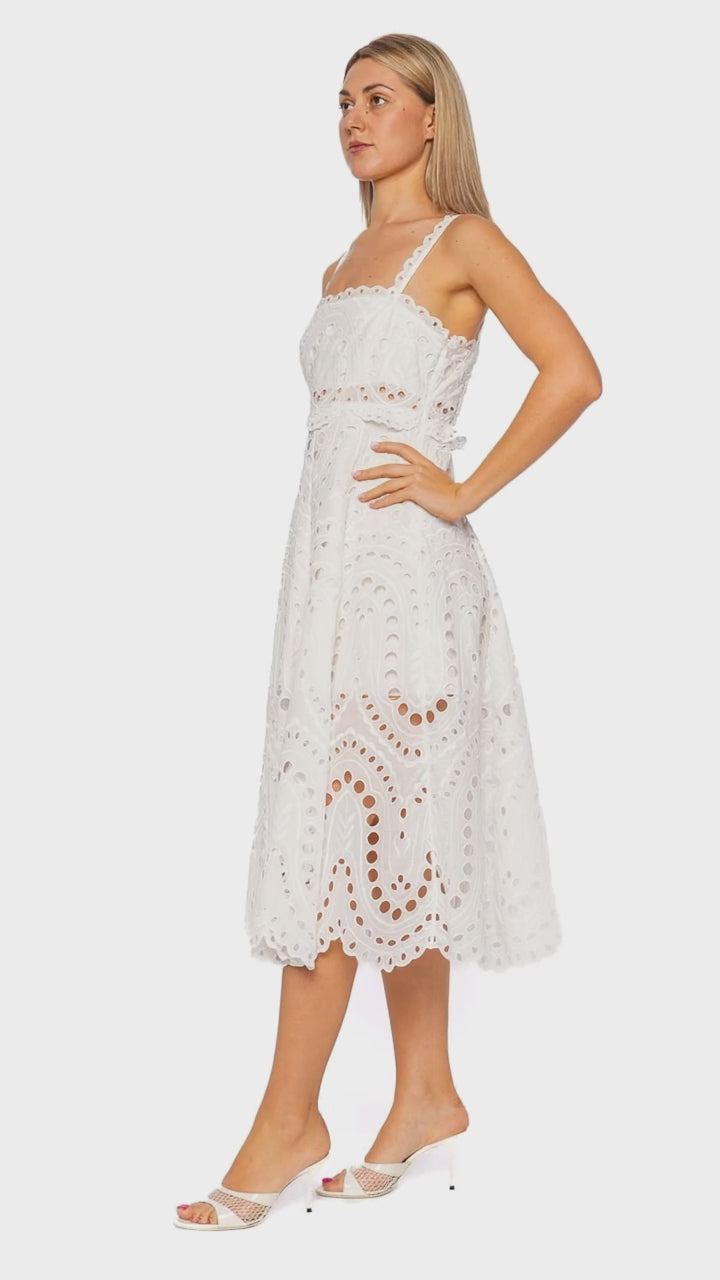 Elevate your warm-weather wardrobe with this exquisite White Sealace Embroidered Midi Dress. Crafted from delicate, scalloped lace, this sophisticated piece exudes feminine charm and elegance. The fitted bodice with intricate embroidery transitions into a fluid skirt that drapes gracefully, making it ideal for both day and evening events. Pair it with strappy sandals and a delicate necklace for a chic ensemble.