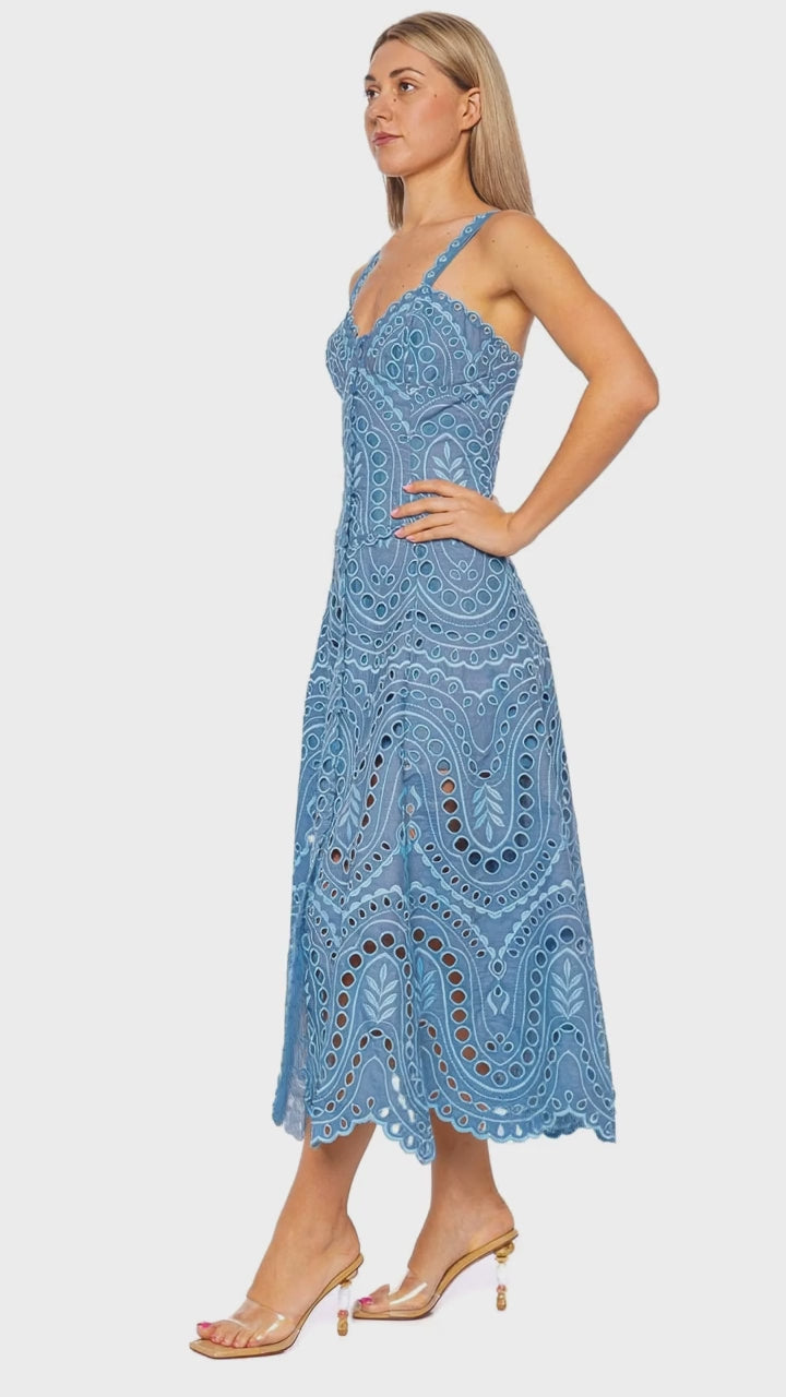 Solace Blue Embroidered Midi Dress with Straps