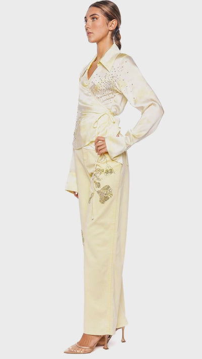 This long sleeve blouse features a wrap-style silhouette creating a V neckline and complete with a belted waist. This tie-dyed style is embellished with splash crystals.