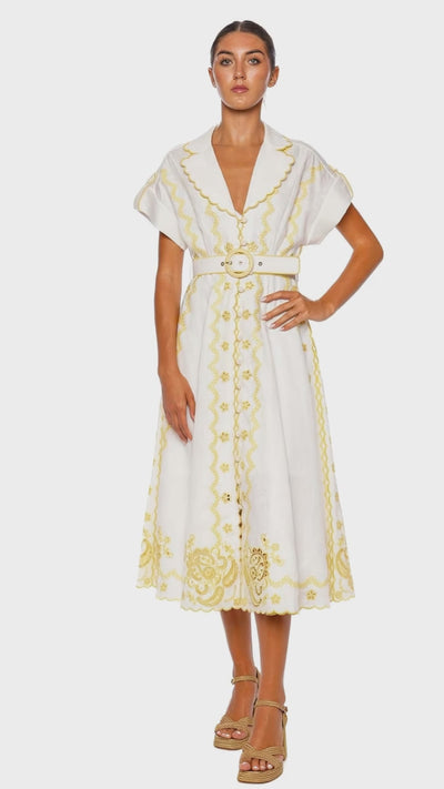This linen midi dress features an embroidered paisley pattern with eyelet detailing and scalloped trim. A self-covered belt completes the shirt style silhouette.