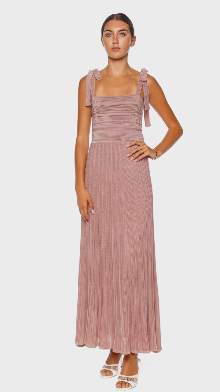 A metallic knit dress featuring fitted bust and self tie shoulder straps.
