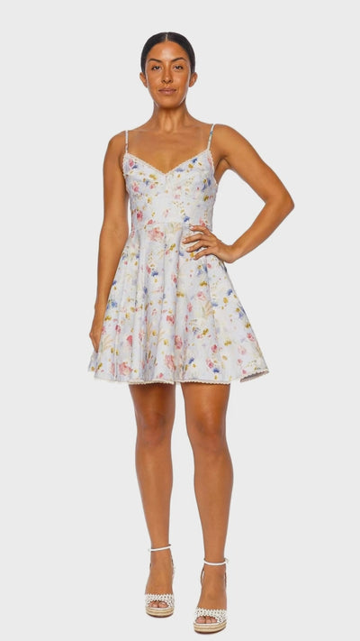 A linen mini dress featuring a fitted bodice, plunging V-neckline and a gathered waist skirt.