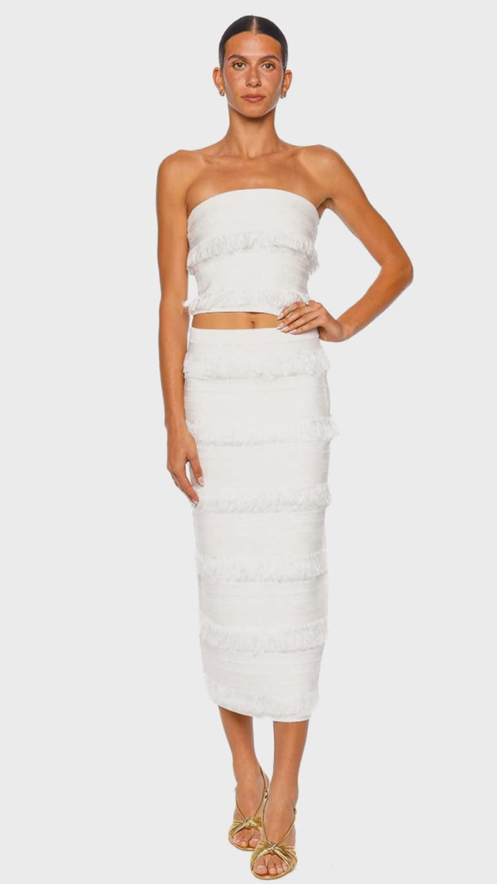 Elevate your wardrobe with this luxurious ivory knit midi skirt, featuring chic tonal stripes and delicate fringe detailing for a modern, textured finish. The sleek silhouette hugs the body in all the right places, offering a sophisticated yet playful appeal perfect for both day and evening occasions. Crafted from premium knit fabric, this skirt embodies refined elegance and timeless style. Pair it with the matching bandeau top and strappy heels for an effortlessly polished ensemble.
