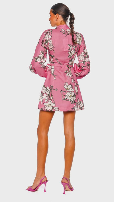 Pink Magnolia Print Linen Mini Dress with Long Bishop Sleeves