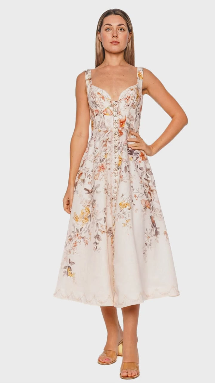 Exude timeless elegance in the Luna Cream Songbird Midi Dress, adorned with delicate floral patterns. This enchanting piece features a sophisticated button-front design that beautifully complements its flowing silhouette. Perfect for garden parties and evening soirees, it combines classic charm with modern sensibilities. Pair with strappy sandals and a statement clutch for a chic ensemble.