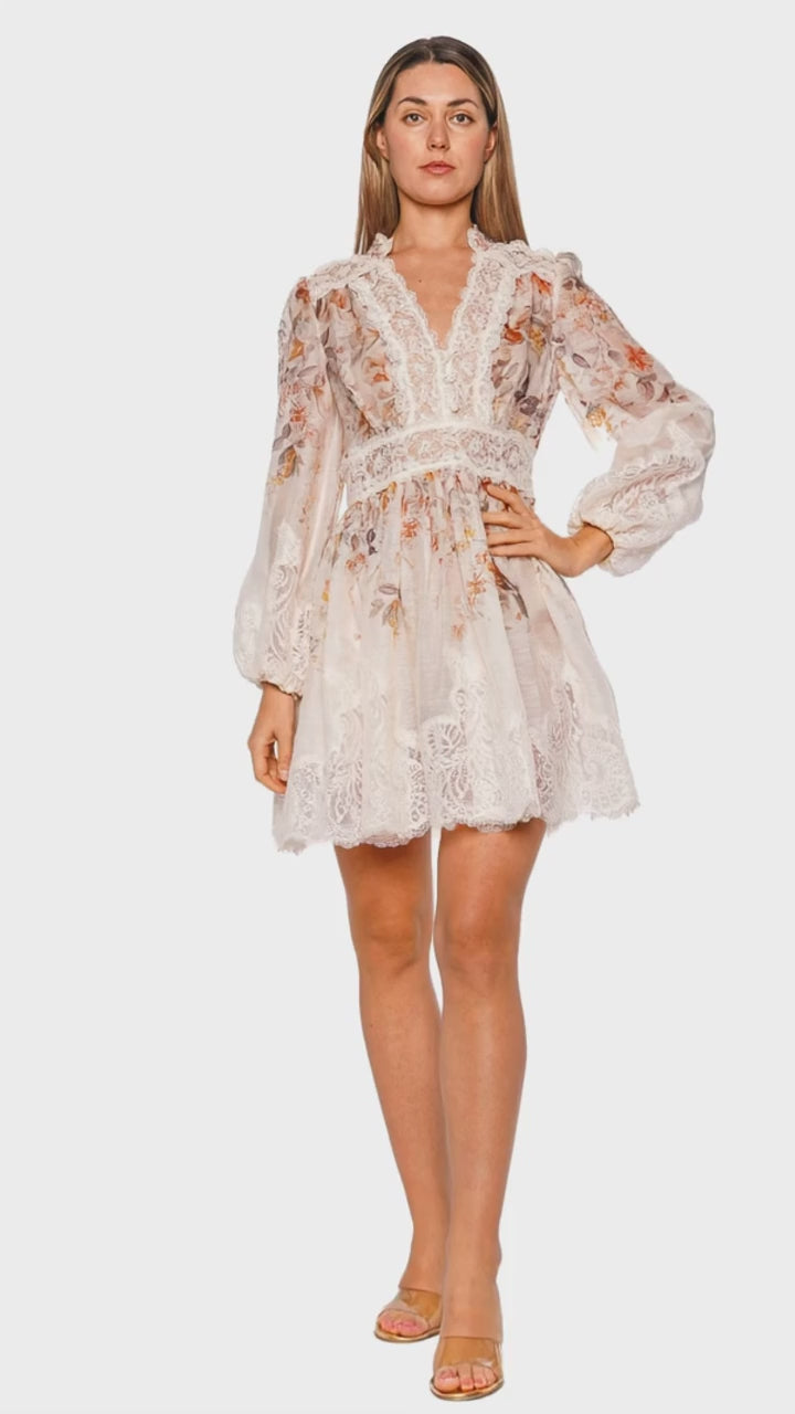 Embrace ethereal elegance with the Luna Lace Cream Mini Dress, featuring romantic long sleeves and intricate lace detailing. This luxurious dress is rendered in a delicate cream hue with whimsical songbird and floral motifs, perfect for elevating any occasion. The voluminous lantern sleeves and fit-and-flare silhouette offer a timeless charm, effortlessly blending sophistication and femininity. Pair with understated accessories and heeled sandals for a graceful ensemble.