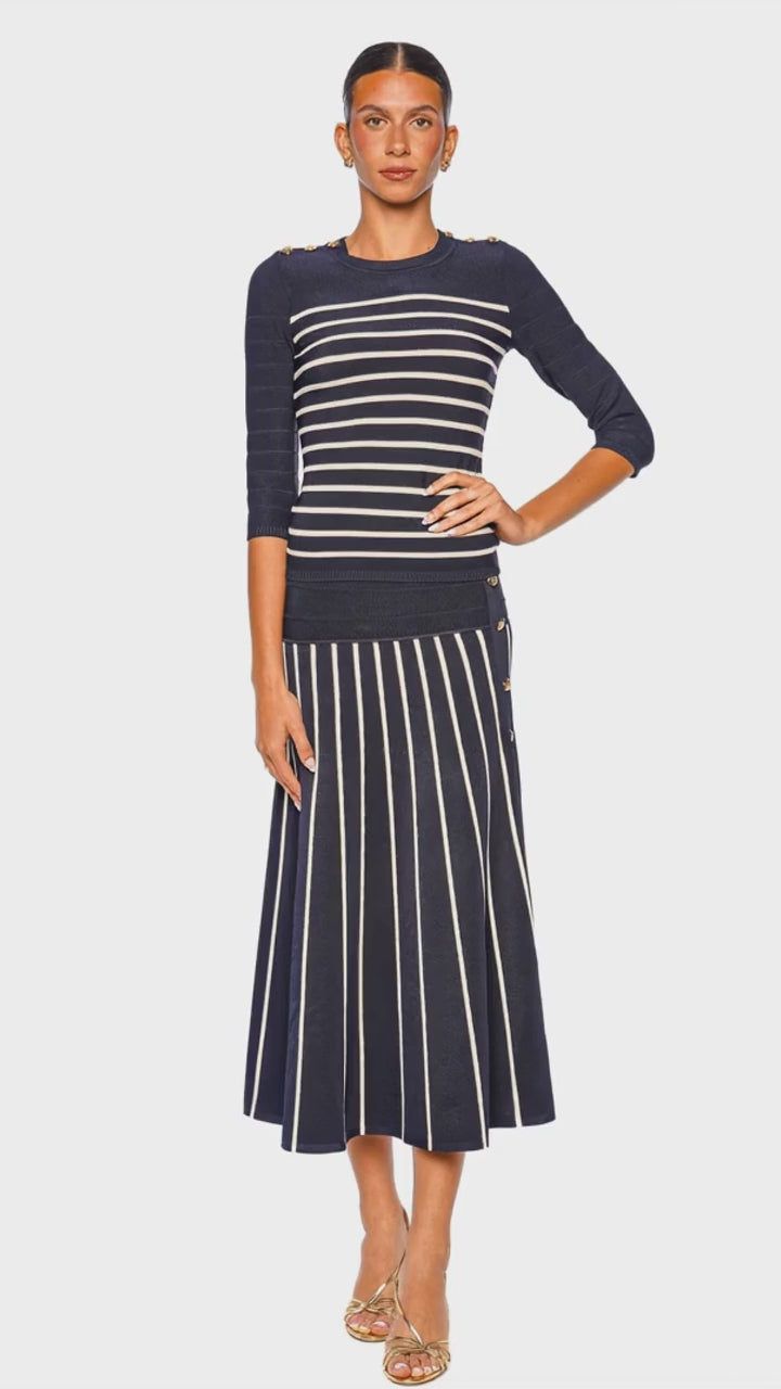 This refined knit top brings a polished nautical sensibility to your wardrobe with its navy and cream striped design and sleek fitted silhouette. Crafted in a luxe ribbed knit, it is elevated by gold-tone button detailing at the shoulders for a sophisticated finish. The three-quarter sleeves and streamlined shape make it an effortlessly flattering piece for both daytime elegance and evening polish. Wear it with the coordinating skirt or style it with tailored white trousers and heels for a chic modern ensemble.