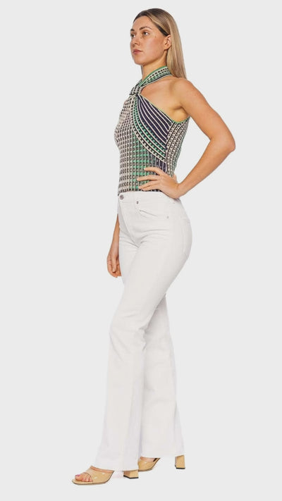 Elevate your wardrobe with the Lyrix Midnight Multi Halter Top, a masterpiece of vibrant patterns and sleek design. Tailored from a luxurious knit fabric, this halter top features a dynamic color palette that infuses your look with modern elegance. Perfect for pairing with both casual and formal attire, it offers a striking visual appeal that makes a statement. Pair it with high-waisted pants or skirts for a fashion-forward ensemble that commands attention.
