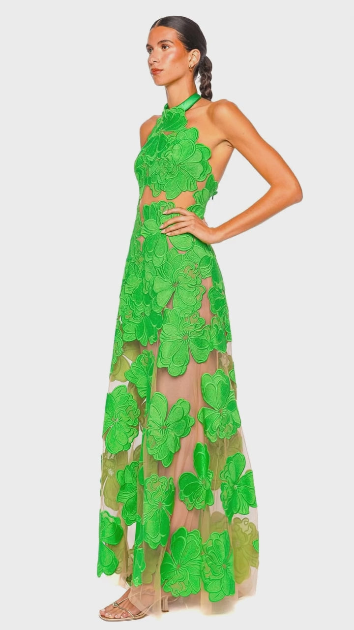 This striking maxi dress is a masterpiece of design, featuring intricate floral appliqués in a vivid green that contrast beautifully against the sheer fabric. The halterneck silhouette elegantly highlights the shoulders, while the full-length skirt flows gracefully for a mesmerizing effect. Perfect for making an entrance at any formal event, this dress embodies both modern flair and timeless elegance. Style it with minimalist accessories and strappy heels for an unforgettable look.