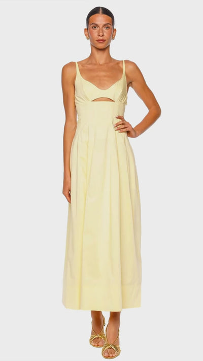 Effortlessly elegant, this buttercream cotton midi dress features a refined silhouette with a modern cutout detail at the bodice. The soft, breathable cotton fabric ensures comfort while exuding contemporary sophistication, perfect for sunlit gatherings and chic soirées alike. Delicate adjustable straps and a gently flared skirt create a flattering, feminine shape that moves with you. Style it with gold heels and minimalist jewelry for an elevated summer ensemble.