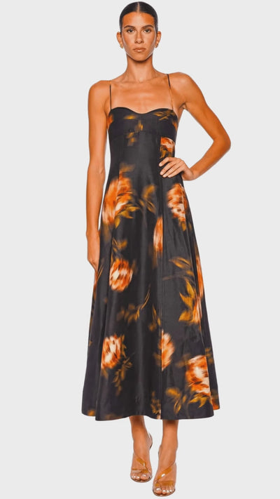 Elevate your evening wardrobe with the enchanting Magdelena Floral Midi Dress, adorned in the exquisite Mira print. Crafted from sumptuous fabric, its fluid silhouette is enhanced by delicate spaghetti straps and a gently fitted bodice and sweetheart neckline, creating an effortlessly elegant look. Perfect for any sophisticated occasion, this dress transitions seamlessly from day to night with a touch of luxe glamour. Pair it with understated accessories for a refined ensemble.