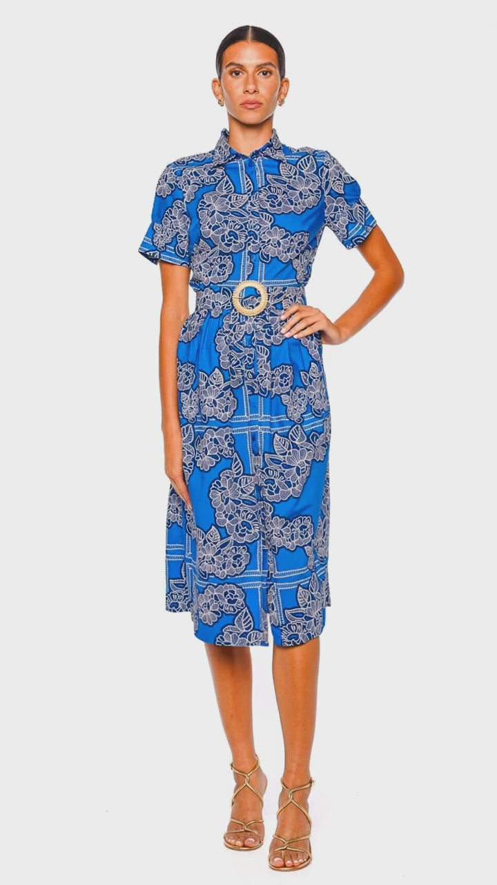 The Malena Cobalt Midi Dress is a stunning showcase of intricate floral print resembling carved petals. Its striking cobalt blue hue combined with a tailored silhouette and short sleeves makes it a versatile choice for any season. The cinched waist with a decorative belt adds an element of refined elegance, making this dress perfect for both casual and formal occasions. Pair it with delicate heels and statement earrings for an elevated ensemble.