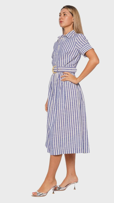 Malena Blue Stripe Seersucker Belted Midi Dress