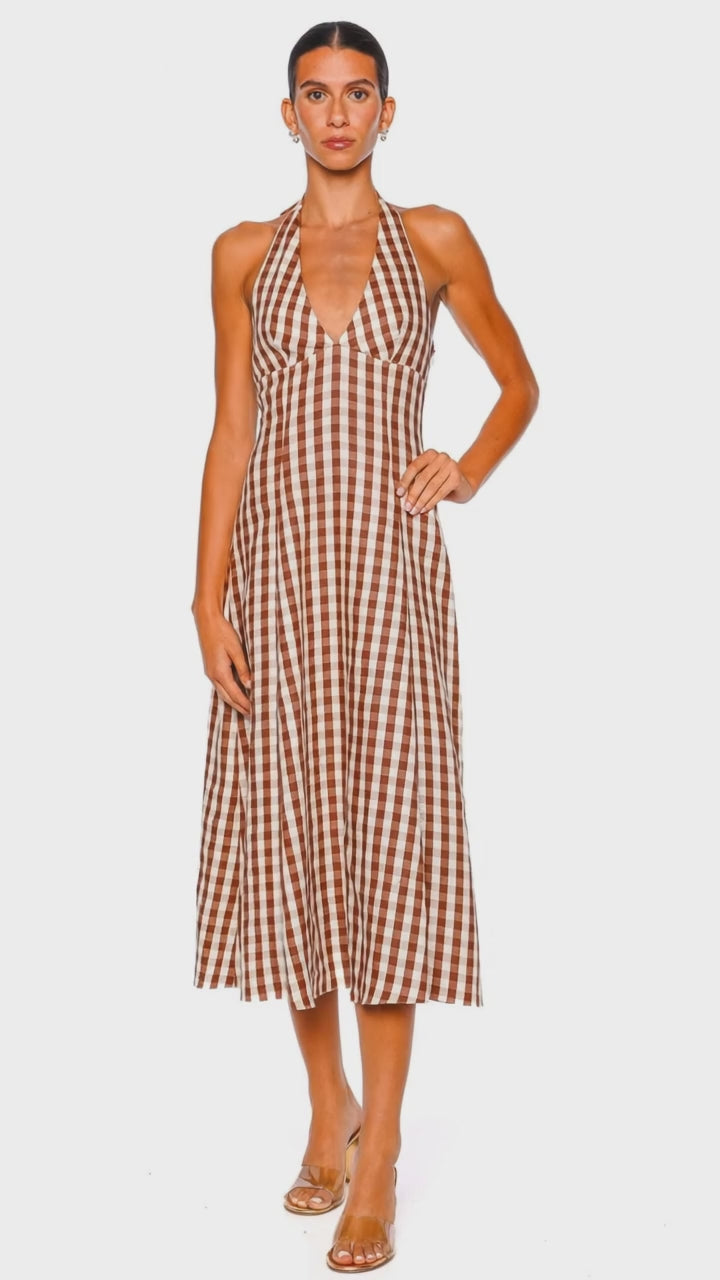 Exude effortless sophistication with the Marais Gingham Cedar Halter Midi Dress. This piece features a flattering halter neckline and a timeless gingham pattern in a warm cedar hue, perfect for both casual brunches and elegant garden parties. The meticulous cut ensures an impeccable fit, celebrating femininity with grace and charm. Pair this dress with nude heels and delicate accessories for a refined daytime look.
