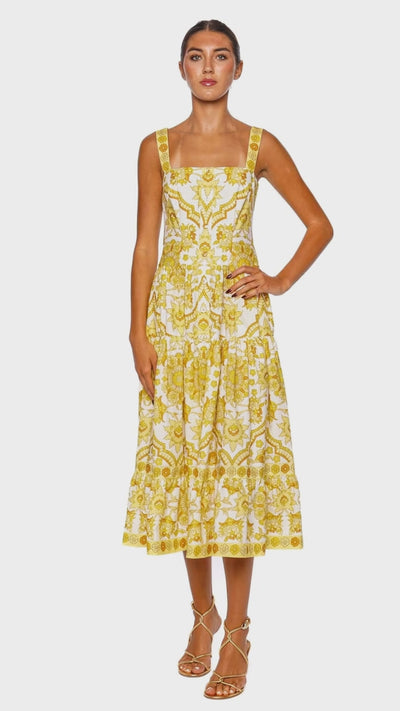 This sleeveless midi dress features a fitted bodice with French darts at the bust, flowing into a full tiered skirt for an A line silhouette.