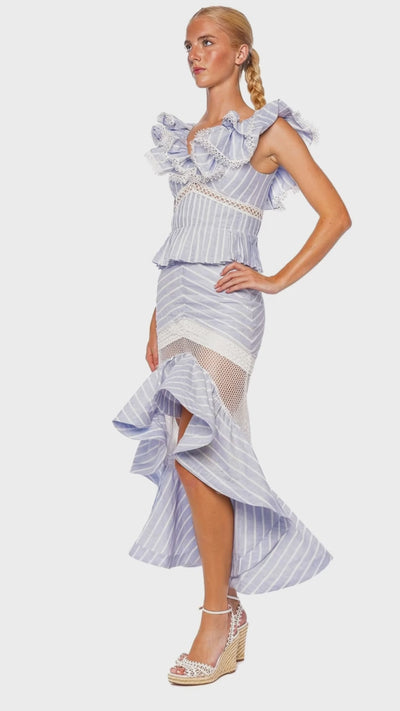 This peplum top features a ruffled lace trim neckline and cutout detail along the bodice into a pleated hemline.