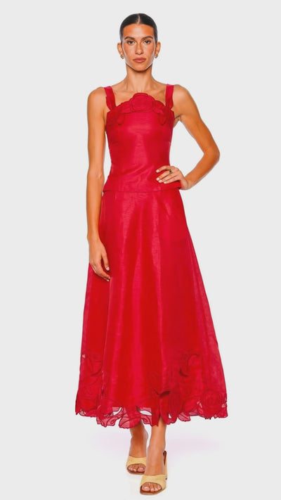Capture the essence of refined elegance with this scarlet maxi skirt, exquisitely crafted from luxurious linen. The delicate applique detailing and flowing silhouette make it a standout piece in any wardrobe. Perfectly suited for both daytime sophistication and evening allure, this skirt can be effortlessly dressed up or down. Wear it with a matching linen top and nude heels for an elevated ensemble.
