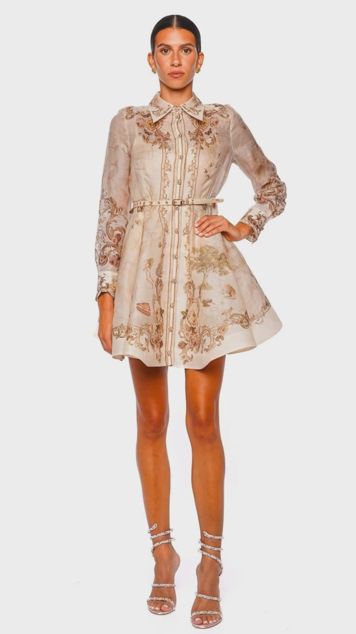 Elevate your wardrobe with the Memento Map Print Mini Dress, a true embodiment of luxury and artistry. This dress features a captivating vintage map print on a silk-linen organza, accentuated by a structured silhouette that flatters any figure. The long sleeves and collared design add a touch of sophistication, making it an ideal choice for both casual and formal settings. Pair it with chic ankle boots or elegant heels for an unforgettable statement look.