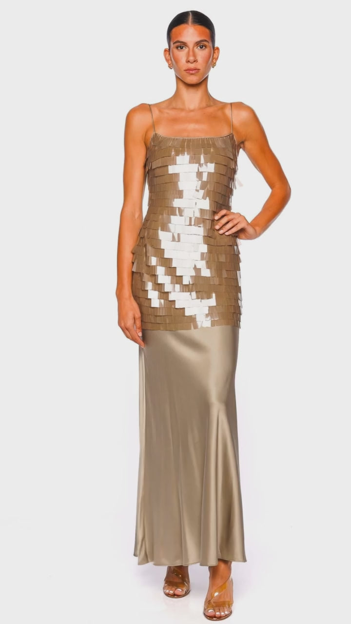 Crafted with large square sequin paillette embellishments across the bodice, the Mesa Maxi Dress captures the perfect balance of glamour and elegance. The stunning Riverstone hue enhances the luxurious satin of the fabric of the skirt, creating a head-turning look for special occasions. With its sleeveless silhouette and fluid maxi length, this dress is designed to elevate your evening ensemble with sophisticated allure. Complement with metallic heels and statement earrings for an unforgettable style statement.