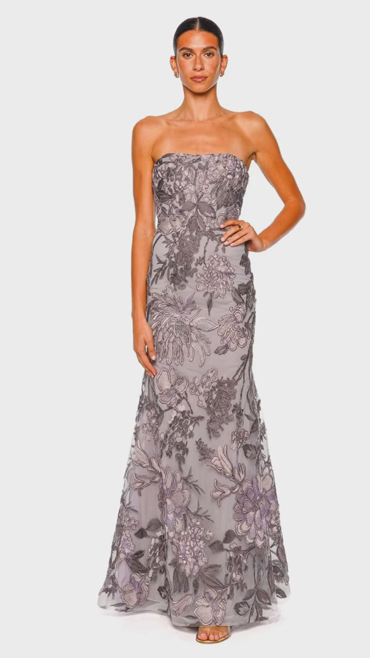 Embrace opulence with this metallic raffia gown, artfully crafted in a stunning lilac and silver palette. The strapless design accentuates an elegant neckline, while the fit and flare silhouette delivers a timeless appeal, making it a perfect choice for any grand occasion. Exquisitely detailed with intricate floral motifs, this gown embodies a harmonious blend of sophistication and luxury.