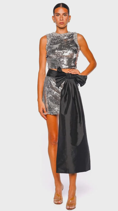 Dazzle in the Moonlight Sequin Sleeveless Top, hand-embroidered in stunning silver sequins that beautifully catch the light. This sophisticated top is perfect for evening occasions, exuding elegance and glamour with its sleeveless silhouette and pearl-embellished trim and the neckline and arms. Pair it with tailored trousers or a sleek skirt to complete your show-stopping ensemble.
