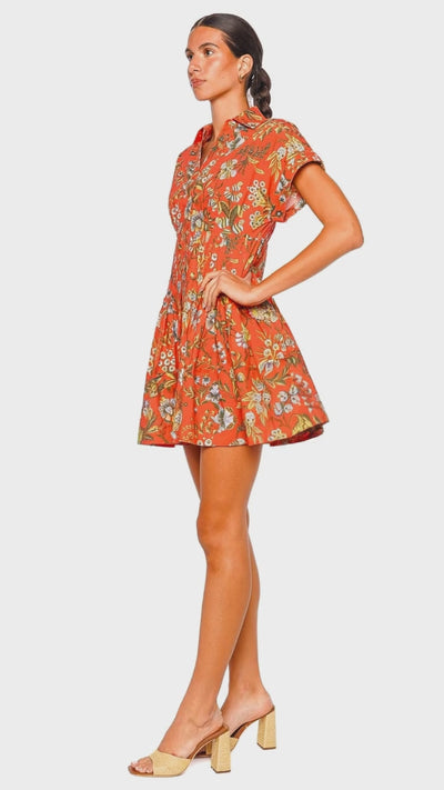 Indulge in the vibrant allure of this mini dress, crafted from premium fabric in a lively floral pattern. The flirty silhouette and playful cap sleeves exude a youthful charm, perfect for sun-drenched days or a sophisticated soirée. With its vivid orange hue and elegant design, this dress captures the essence of contemporary femininity, making it a must-have addition to any wardrobe.