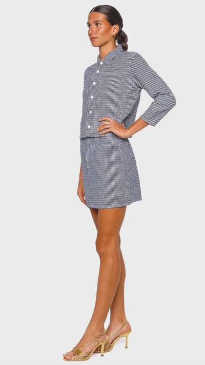 This Nelly Crop Jacket elevates the classic cropped silhouette with a luxe blue and white striped textured fabric, offering a modern twist on timeless tailoring. The structured shape and three-quarter sleeves exude effortless sophistication, while oversized white button details add a refined touch. Perfect for layering, this versatile piece infuses any look with contemporary polish and can be dressed up or down for day-to-night appeal. Style with the matching mini skirt or tailored trousers and heeled sandals for a chic, fashion-forward ensemble.