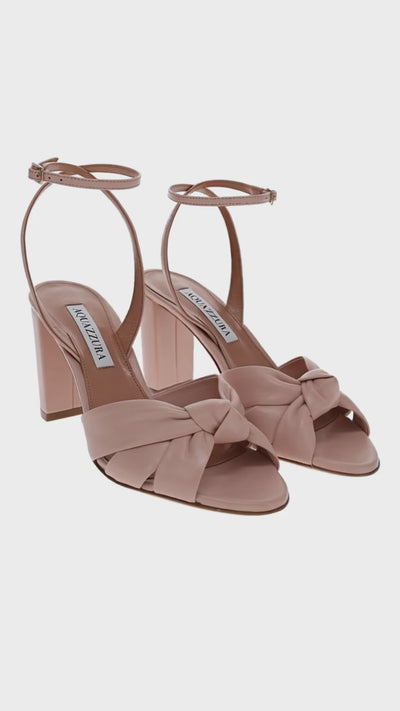 These sandals are crafted from pink leather and feature a knotted design with an ankle strap design.