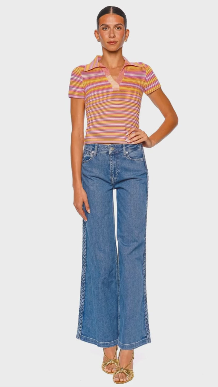 Elevate your casual wardrobe with this luxuriously soft knit polo top, featuring vibrant citrus-inspired stripes in pink, yellow, and orange. The fitted silhouette and short sleeves offer a modern, trend-forward take on a classic polo, while the open collar adds a touch of relaxed sophistication. Crafted for both comfort and statement appeal, this top transitions seamlessly from day to evening. Pair it with tailored denim or a sleek skirt and heeled sandals for an effortlessly polished look.