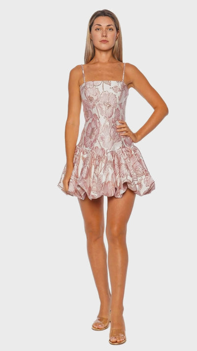 Indulge in the luxurious allure of this Petal Jacquard Pink Strappy Mini Dress, a true epitome of sophistication and style. Crafted from premium jacquard fabric, the dress features a floral pattern in a soft pink hue, creating a romantic yet modern silhouette. Its structured design and voluminous skirt add an elegant touch, making it perfect for both daytime soirees and chic evening affairs. Pair with sleek accessories and heels for a truly captivating ensemble.