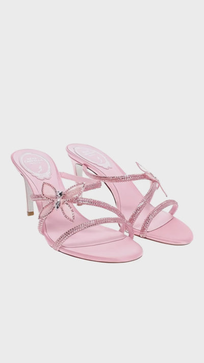 This statement heeled sandal is crafted in a luminous light rose satin with delicate crystal-embellished straps for an unmistakably glamorous finish. A sculptural butterfly detail at the vamp adds a couture-inspired touch, while the slender heel creates an elegant, leg-lengthening silhouette. Equal parts whimsical and refined, this pair is designed to elevate cocktail dresses, sleek tailoring, and occasionwear alike. Style it with a satin midi dress or a sharply cut evening set for a polished luxury look.