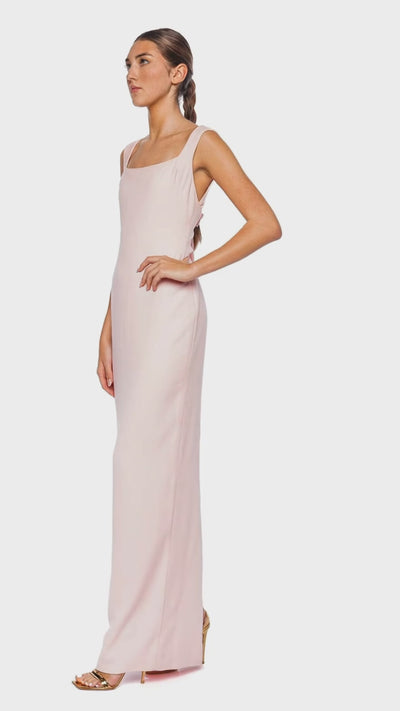 This light pink body con gown features a scooped back with a bow-tie detail.
