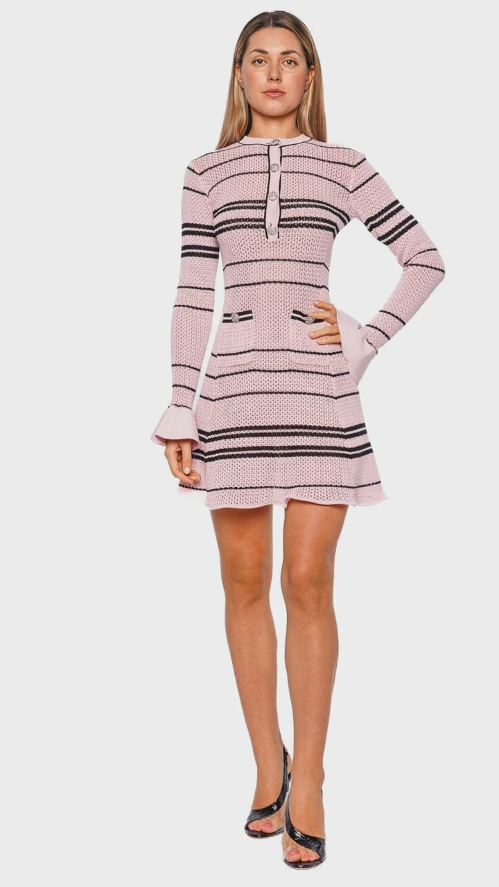 Luxuriously designed for the discerning fashionista, this pink stripe knit mini dress offers a sophisticated take on playful elegance. The intricate knit pattern and structured flared sleeves deliver a statement all their own, making it ideal for any upscale occasion. Perfectly paired with your favorite heels, this chic mini dress effortlessly combines vintage charm with modern appeal.