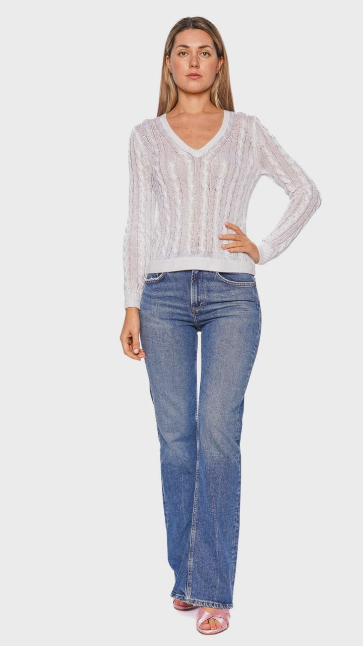 This sophisticated V neck pullover features a beautifully crafted cable knit design, exuding an air of refined luxury. Its classic white hue offers timeless elegance, making it a versatile addition to any wardrobe. Perfect for layering or wearing on its own, this pullover complements both casual and dressy ensembles effortlessly.
