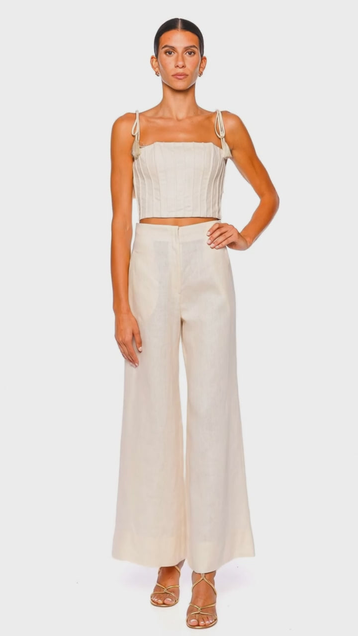 This elegant cropped top features a delicate ivory hue, perfect for adding a touch of sophistication to any ensemble. The tailored fit with beautifully embroidered trim enhances its luxurious appeal, while tie straps add a playful, yet refined touch. Ideal for both casual outings and sophisticated gatherings, pair this top with high-waisted trousers and heels for an effortlessly chic look.
