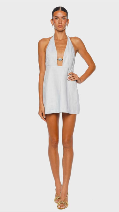 The Rae Mini Dress is a sleek, resort-ready statement in airy aqua blue with a clean A-line silhouette. A plunging halter neckline is elevated by a polished stone-like center hardware detail for a subtly luxe finish. Designed with an open back and tied neck bow, it balances modern allure with effortless elegance. Style it with metallic sandals and a structured clutch for sunset cocktails or elevated vacation evenings.