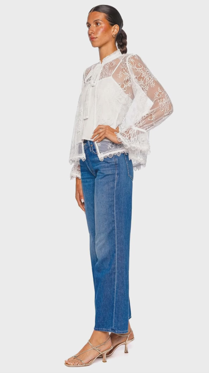 The Ravello Top is a strikingly feminine blouse crafted with intricate sheer lace and a softly layered camisole-style underlay for elegant coverage. A delicate neck tie, scalloped trim, and airy long sleeves lend this piece a romantic, elevated finish that feels both timeless and fashion-forward. Its lightweight silhouette drapes beautifully, making it ideal for everything from polished daytime dressing to refined evening moments. Wear it with tailored trousers or premium denim and strappy heels for an effortlessly sophisticated ensemble.