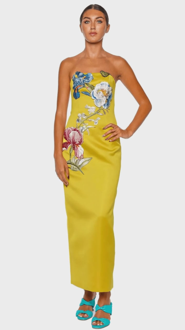 Exuding sophisticated charm, the Rayna Mustard Strapless Applique Floral Maxi Dress features a striking silhouette that captivates. Crafted from a luxurious fabric, it showcases intricate floral applique detailing that adds a touch of artistry and elegance. This strapless design is perfect for making a bold statement at upscale events or glamorous evenings. Pair with elegant heels and minimal accessories for a refined, fashion-forward look.