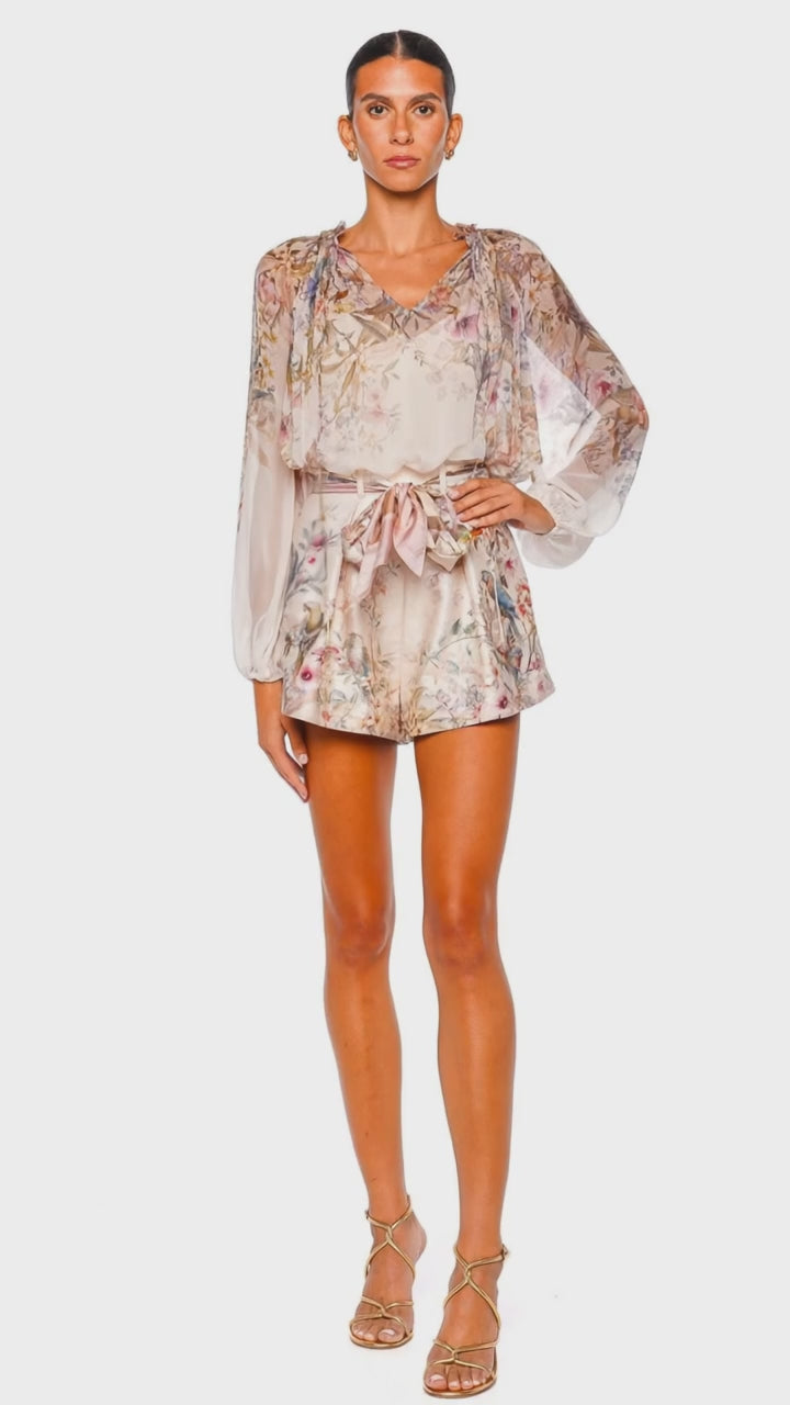 This striking billow sleeve blouse exudes a spirit of seamless luxury with its elegant cream aviary print. Crafted from a delicate sheer fabric, the blouse offers a whimsical design perfect for both daytime sophistication and elegant evening allure. The fluid silhouette and intricate detailing make it the epitome of refined femininity. Pair it with structured trousers and metallic accents for a chic ensemble.